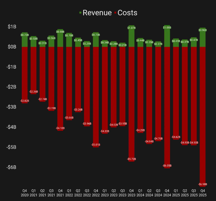 No quarto trimestre de 2025, a divisão Reality Labs gastou quase US$ 7 bilhões, gerando um prejuízo de aproximadamente US$ 6 bilhões, considerando uma receita inferior a US$ 1 bilhão.